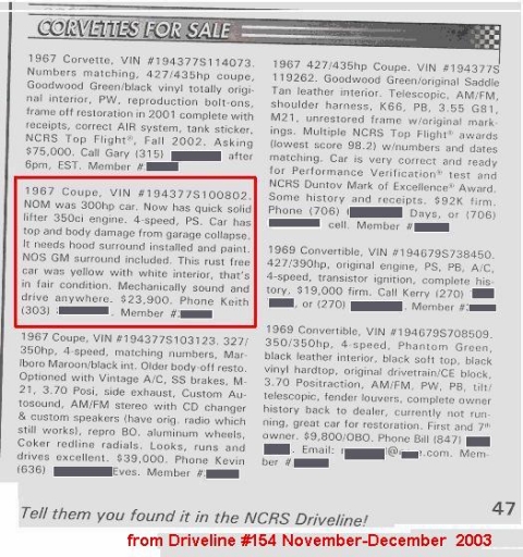 An old friend Loren "LeMans" Lundberg alerted me and others to this possible inconsistency in the descriptions and/or typographical errors in the presentation of 1967 coupe VIN 802. If this be the same sow, then she certainly is proof that you can make a silk purse out of a ....