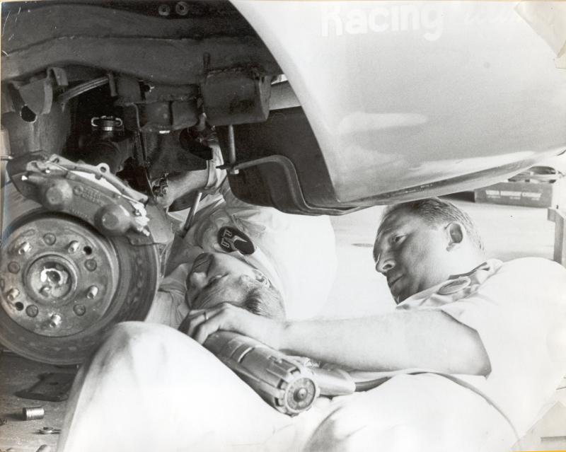 Several days ago, someone was asking about the dual pin J56 calipers on the rear. Here is a shot of the ones on the James Garner A.I.R. Corvettes. Now these had been made in the shop and one thing curious is the use of the angled front style backing plate pad on the outside and the standard style pad on the inside.