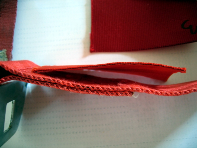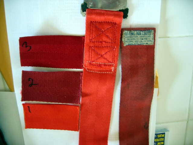 I posted recently about selecting appropriate repro webbing for a set of red seatbelts for a '62. Well, I lucked into a set of original red belts from a '62 (May build date) and thought I'd share the attached images. On the right is an uncleaned belt, while the one in the middle is after an hour in undiluted Simple Green, much plastic bristle brushing, and then a run through the heavy soil cycle in cold water in the washer. (And yes, the tongue looked like that before I started....) So originally I would have chosen sample #3, but now would definitely pick #1 (there were sun-protected areas of the original belts before cleaning that were the same hue as sample #1). So the originals have a lot more orange in them that I would have thought. Also, the next post contains a shot comparing the thickness of the sample vs. original. The old belts are definitely a lot thicker. The belts cleaned up so nicely that I'm just going to put them in the car and have the vendor just clean up the female buckles.