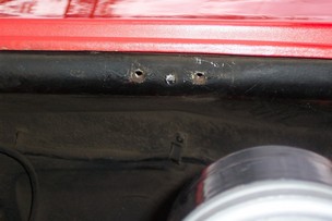 Does the air cleaner nut plate on this purported 1958 ex-fuel injection car look correct? It appears to have been affixed with three rivets instead of one: